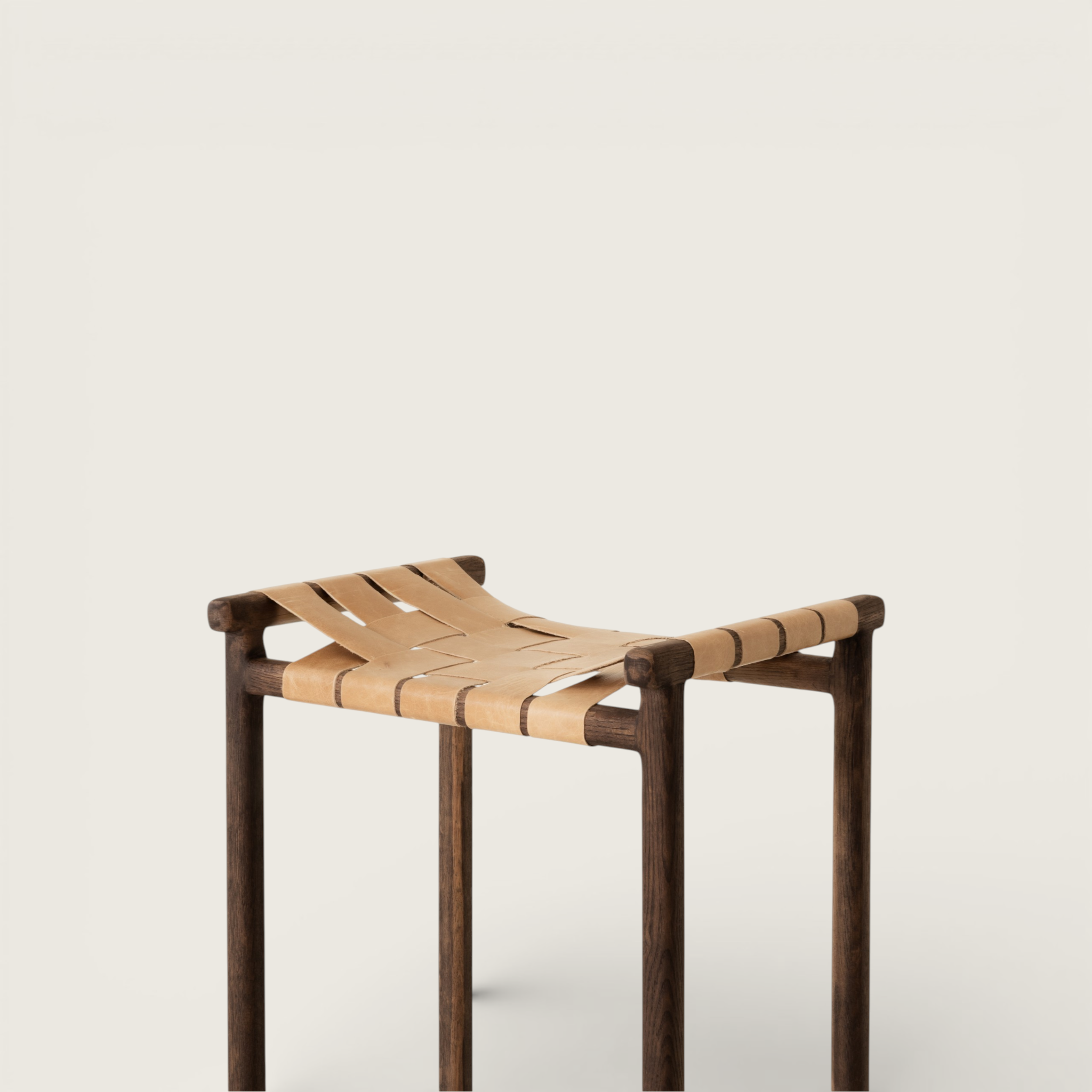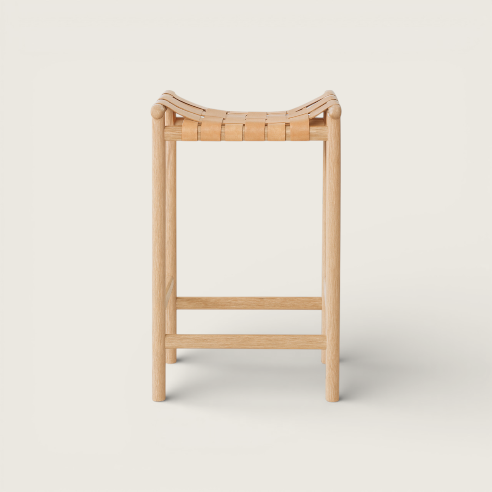 The Ziri Stool is woven with caramel leather, wrapped around a solid oak frame featuring slightly lifted side stretchers to create a modern, streamlined silhouette.